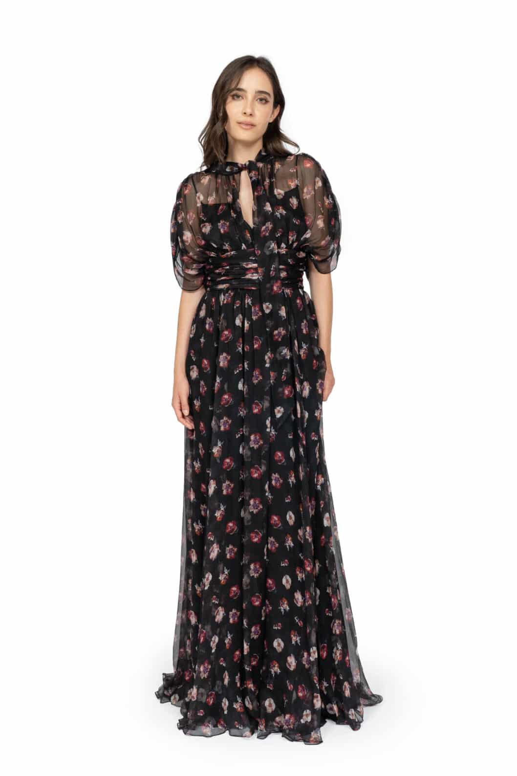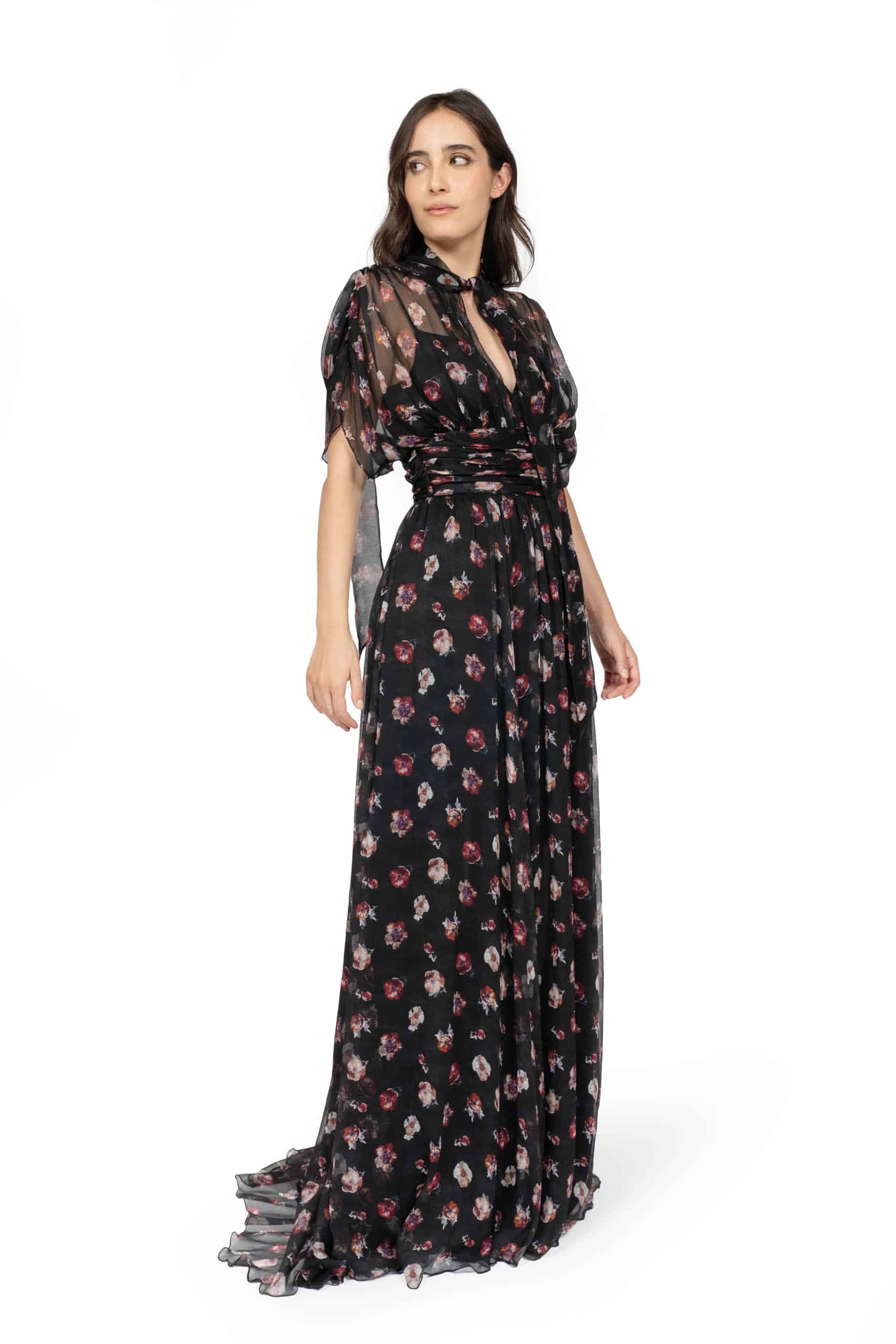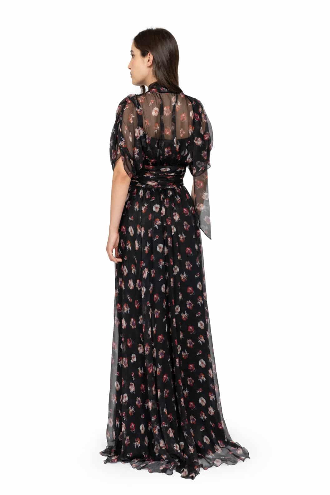 This elegant maxi dress is crafted from lightweight chiffon adorned with a pansy flower print in black. Featuring a softly structured high neckline and flowing batwing sleeves, it combines grace and modern sophistication. The fluid silhouette moves effortlessly, making it ideal for both formal occasions and stylish daytime events.