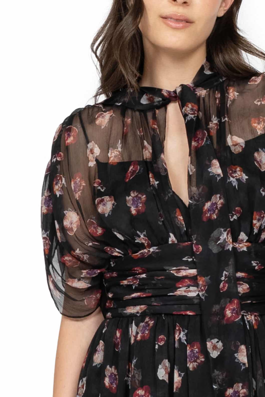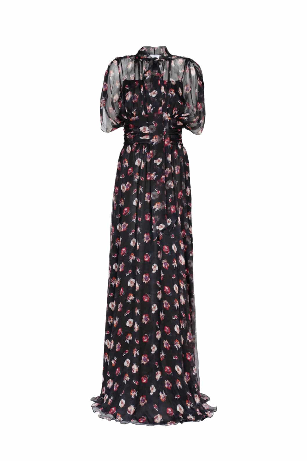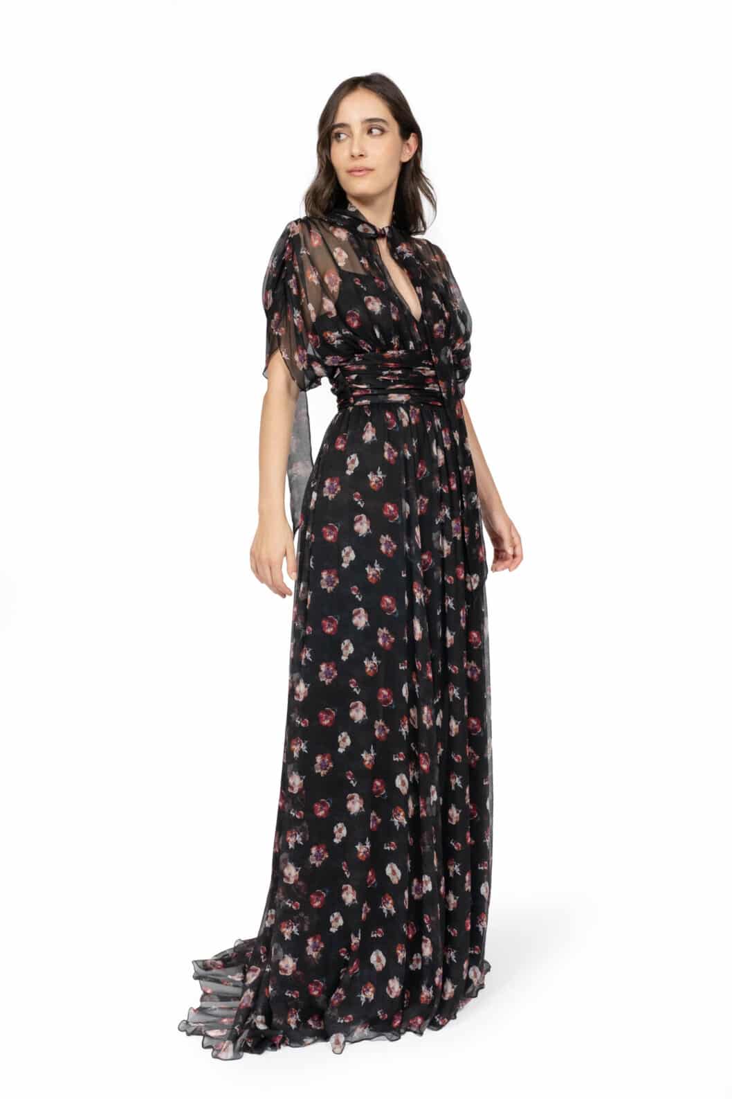 This elegant maxi dress is crafted from lightweight chiffon adorned with a pansy flower print in black. Featuring a softly structured high neckline and flowing batwing sleeves, it combines grace and modern sophistication. The fluid silhouette moves effortlessly, making it ideal for both formal occasions and stylish daytime events.