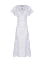 The sleeveless dress is crafted from lace and sequins. It features an A-line silhouette and a midi length. There is a V-shaped opening at the center front. It is sold in conjunction with its matching shawl cover-up. The lace is fully lined with organza. This dress is the perfect choice for achieving an ethereal and elegant look at a summer wedding.