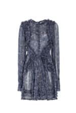 Short silk chiffon dress with micro flowers print, featuring long sleeves and pleats. It has a front button closure and a back zipper.