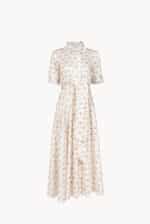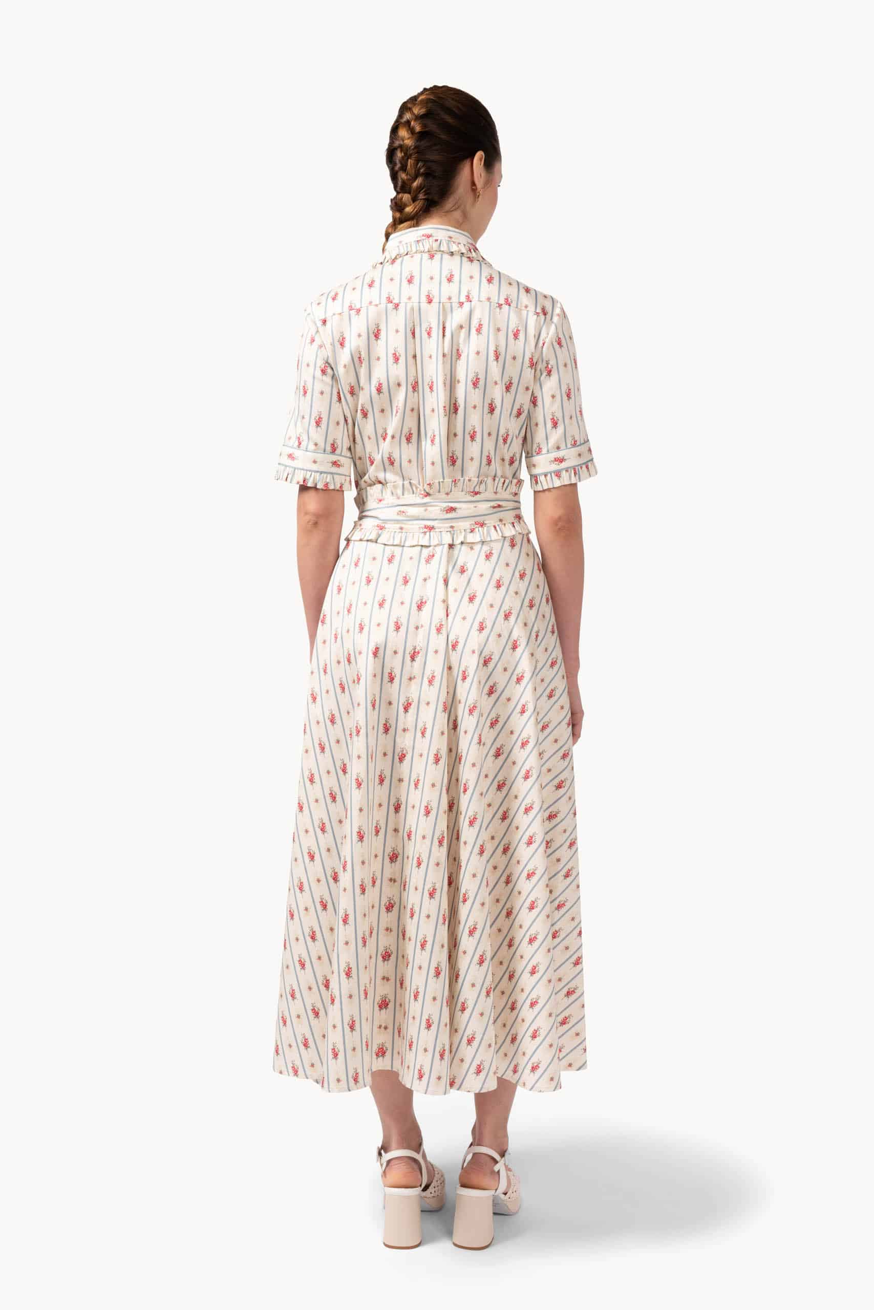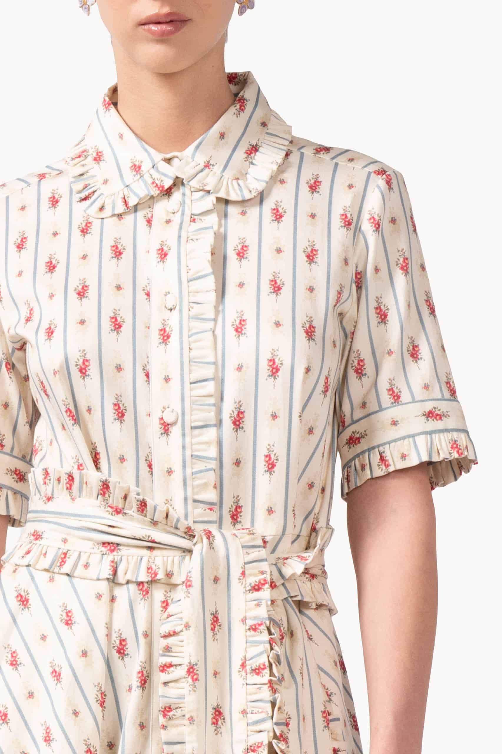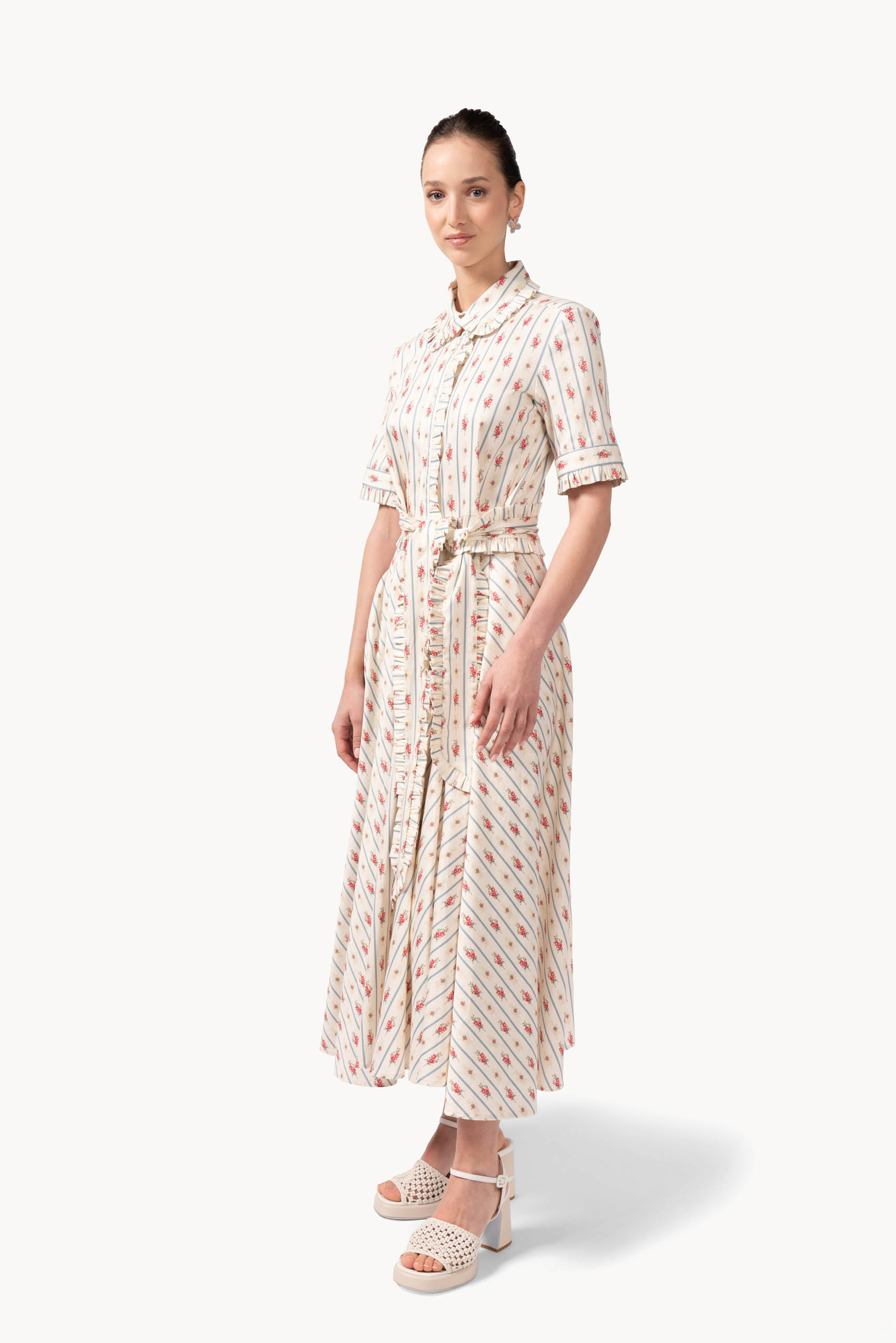 A modern twist on the classic shirt dress, with short sleeves, a defined waist, and a midi-length skirt that moves effortlessly. The mix of floral and striped patterns gives a fresh, eye-catching design perfect for versatile styling.