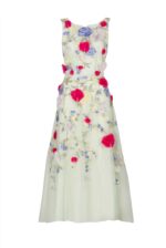 This sleeveless and midi-length dress is crafted from tulle with 3D floral embroidery and appliques. It features a fitted bodice and a gathered waist that flares into a skirt. Floral embroidery appliques are stitched throughout the entire surface. Wear it to a ceremony to exude a romantic and elegant charm
