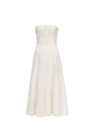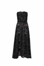 Elegant and alluring, this strapless dress is crafted from luxurious black velvet lace, offering a rich texture and timeless sophistication. The bodice is structured yet delicate, while the soft, flowing skirt creates graceful movement with every step. A perfect choice for evening events or special occasions, where romance meets modern elegance.