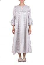 Striped cotton linen stretch blend dress is designed with a ruffle tiered around the yoke and the sleeves, stripe print throughout.