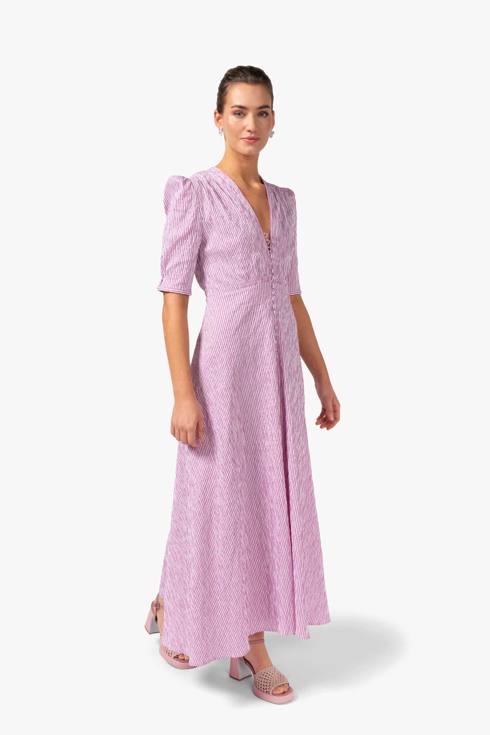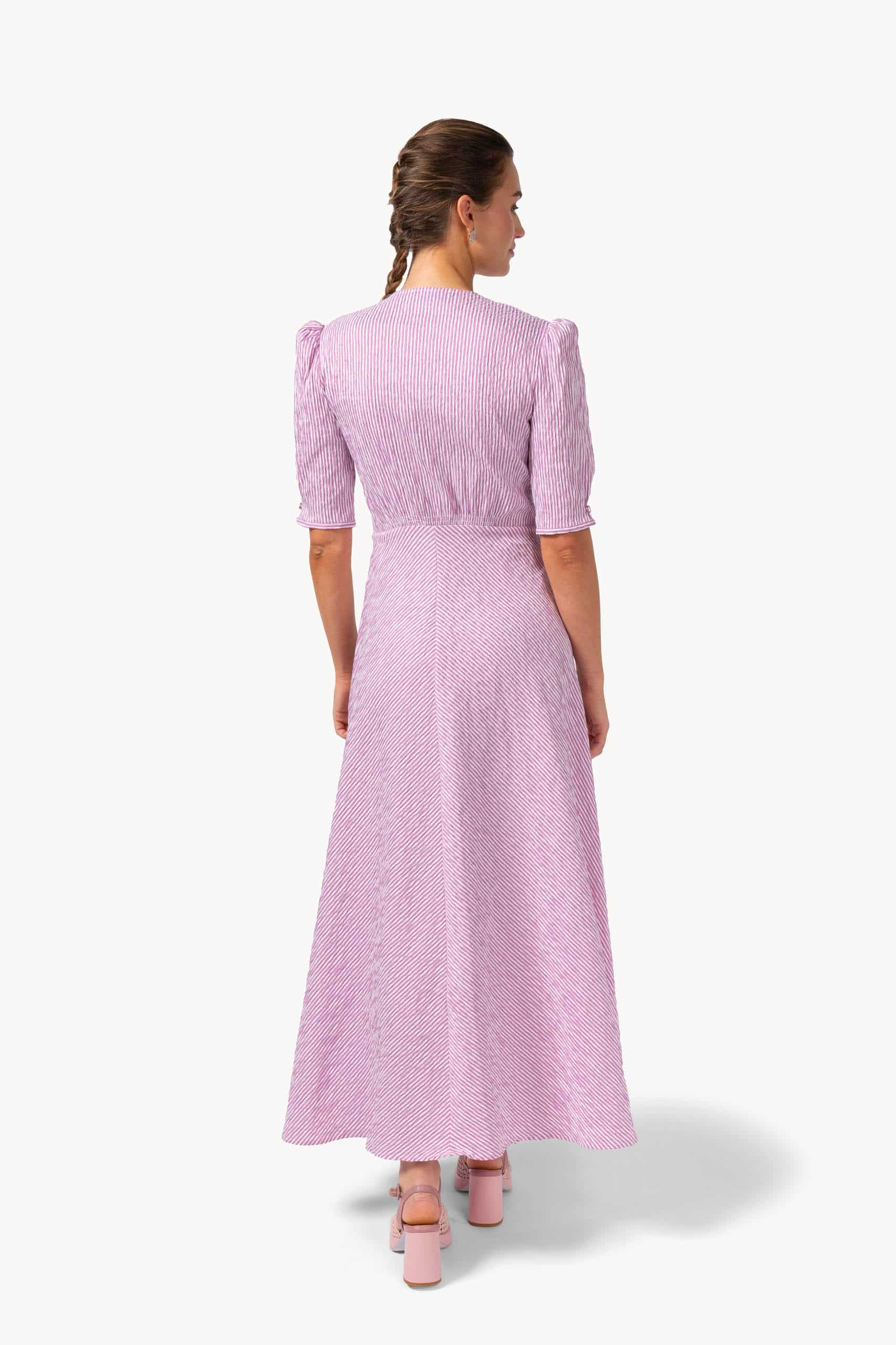 A modern, versatile dress designed with a button-down front for effortless style. The subtle vertical stripes create a sleek, elongating effect, while the tailored yet relaxed silhouette ensures a flattering fit.