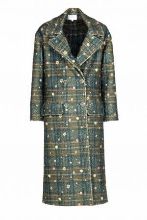 This coat is made with wool printed with flowery print. It’s fully lined and double breasted with a V neckline opening in the front and two pockets on the side.