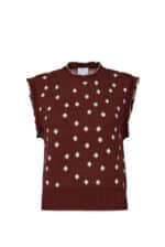 This charming burgundy waistcoat is crafted from a fabric adorned with classic polka dots, blending a tailored silhouette with playful elegance. Perfect worn over a blouse or dress, it adds a distinctive and refined touch to any outfit.