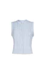 This charming light lilac vest is crafted in a soft cable knit, featuring a cozy texture and delicate femininity. The front is adorned with five buttons, adding a classic touch to the design. Perfect for layering over blouses or dresses, it brings warmth and style to your look.