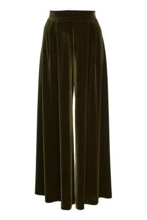 This stretch velvet wide pants are designed with a high waisline and two front pleats.