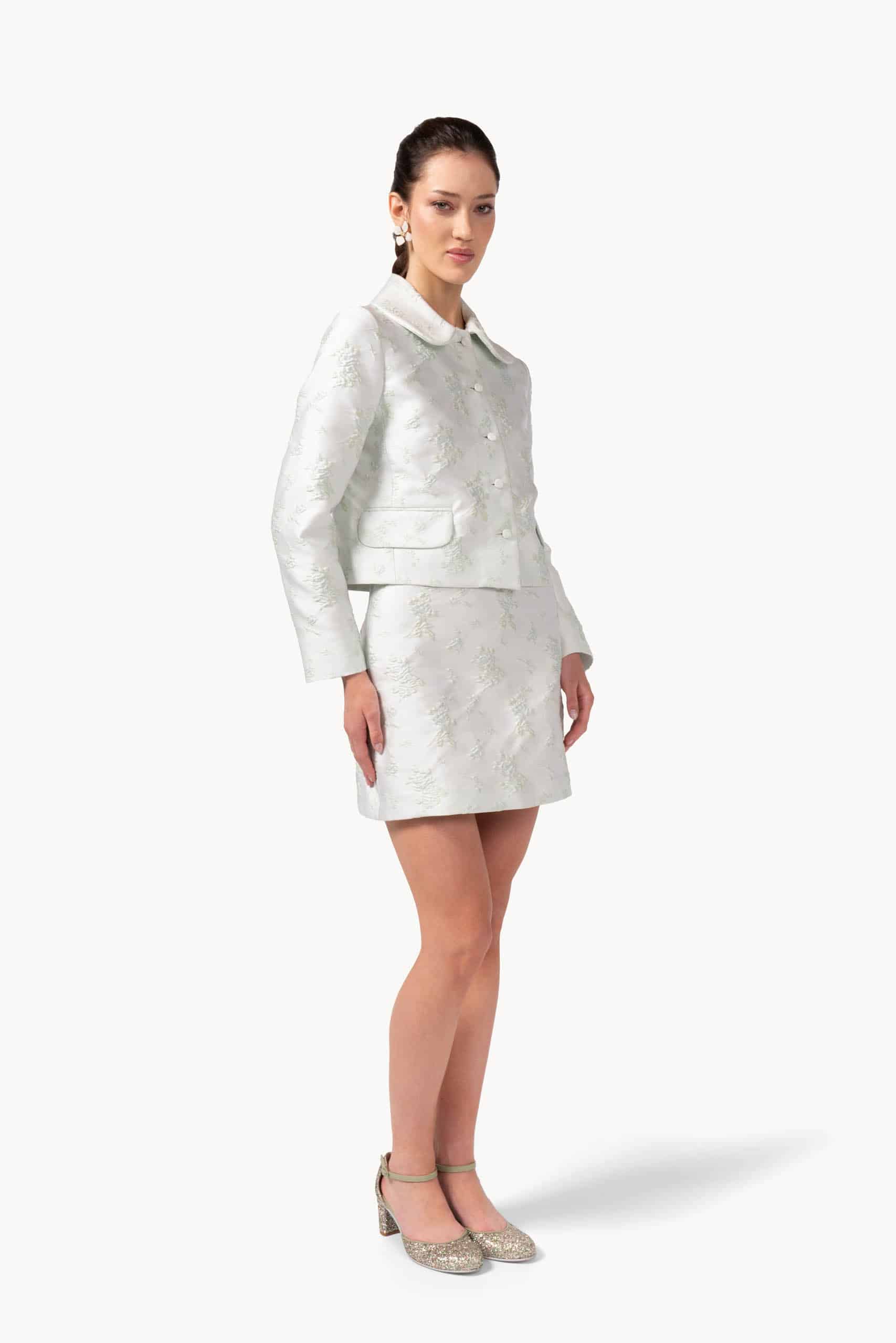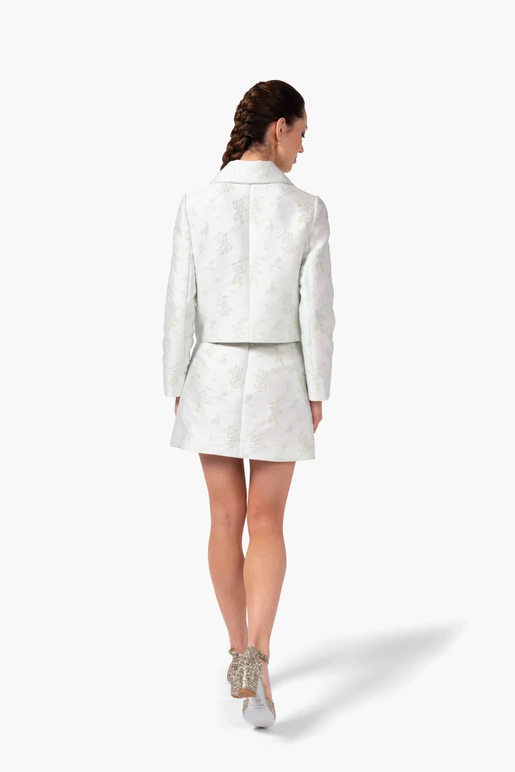 A statement piece for any wardrobe, this brocade skirt features a structured A-line silhouette that intricates woven pattern adds visual interest, making it perfect for elegant daytime events or chic evening looks.