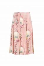 This skirt is made with printed pleated velvet Devore. It has a zip closure on the side and is designed with pleats in the front, an A-line silhouette and a knee length.