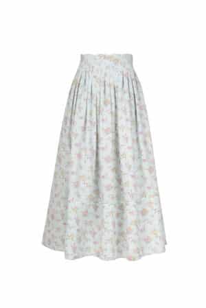 This midi skirt is crafted from cotton printed with the Gilly Flowers pattern. The skirt features flat pleats at the hip area, gradually widening toward the hem. The print culminates at the bottom with a wide red band. It has a concealed zipper closure with a metallic hook on the side. Pair it with its top and bolero (sold separately) for a romantic look suitable for a countryside lunch or a summer day outing.