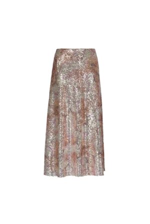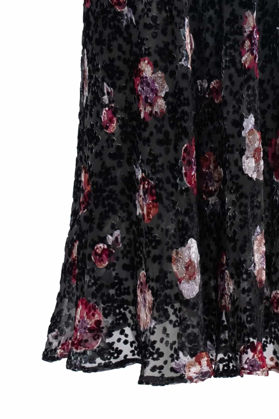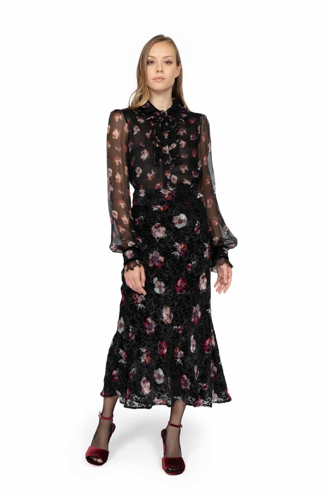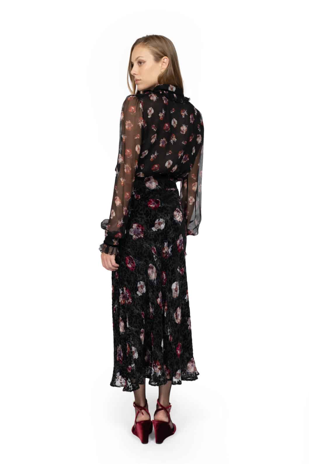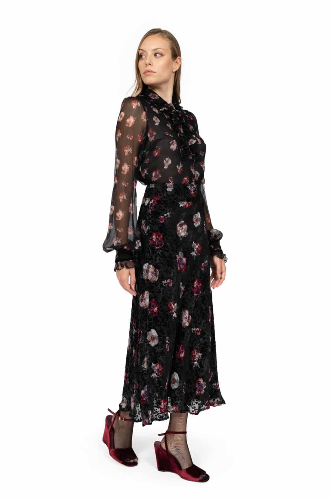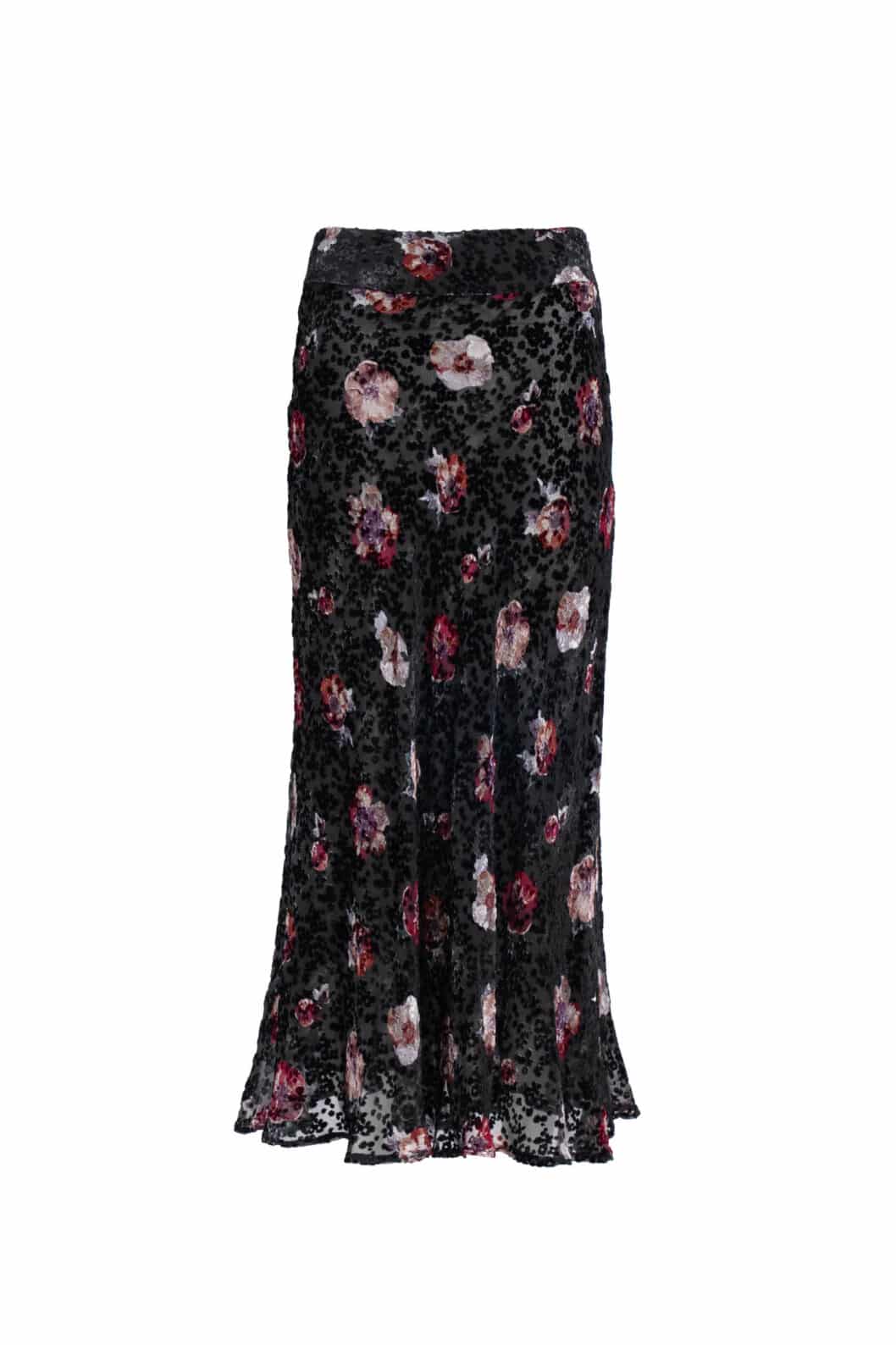 “This elegant black skirt is crafted from a delicate devoré fabric featuring a romantic pansy flower pattern. The semi-sheer texture creates a sophisticated interplay of matte and shine, while the soft movement of the fabric adds fluidity to the silhouette. Perfect for refined daywear or elevated evening looks.