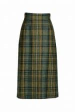 This skirt is cut from a plaid virgin wool. This high-waisted style falls just well below the knee in an A-line silhouette.
