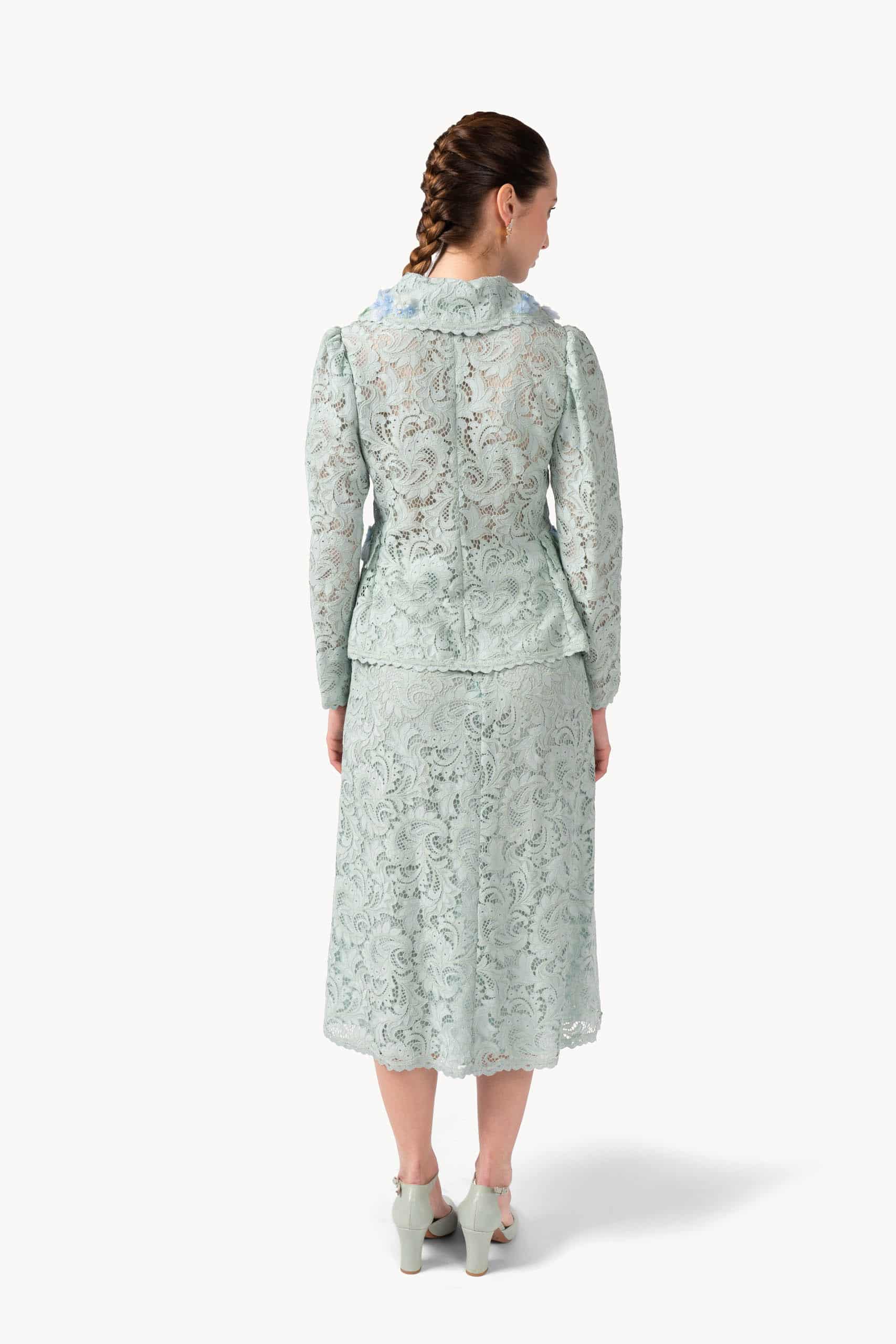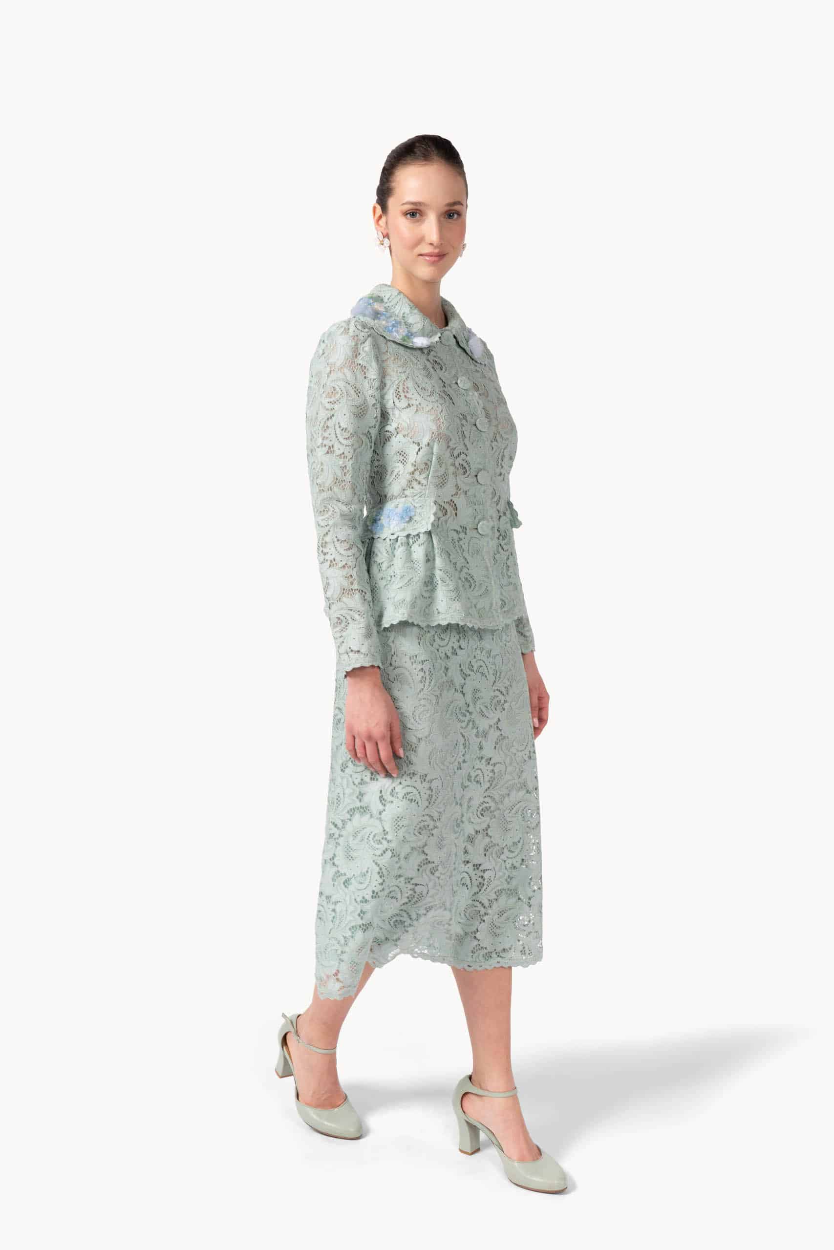 Intricate lace blooms in soft, flowing layers, creating a feminine silhouette full of lightness and subtle charm.