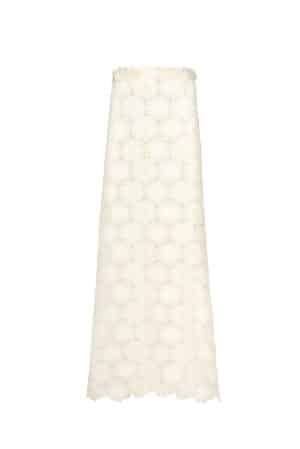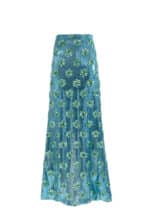 A skirt with a side slit, crafted from the same blue sequin fabric with green floral accents as the previous piece. The shimmering sequins catch the light, while the floral design adds a playful, lively touch. Elegant yet fun, this skirt effortlessly complements a variety of looks with its bold, eye-catching texture.