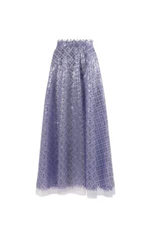 This skirt is made of intricately embroidered tulle adorned with sequins, forming semicircular patterns.. It is cut on the bias to allow the fabric to create a soft ruffle at the bottom. Wear it with its matching top (sold separately) for a dazzling look.