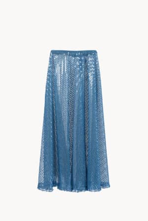 This skirt is made of intricately embroidered tulle adorned with sequins, forming semicircular patterns.. It is cut on the bias to allow the fabric to create a soft ruffle at the bottom. Wear it with its matching top (sold separately) for a dazzling look.