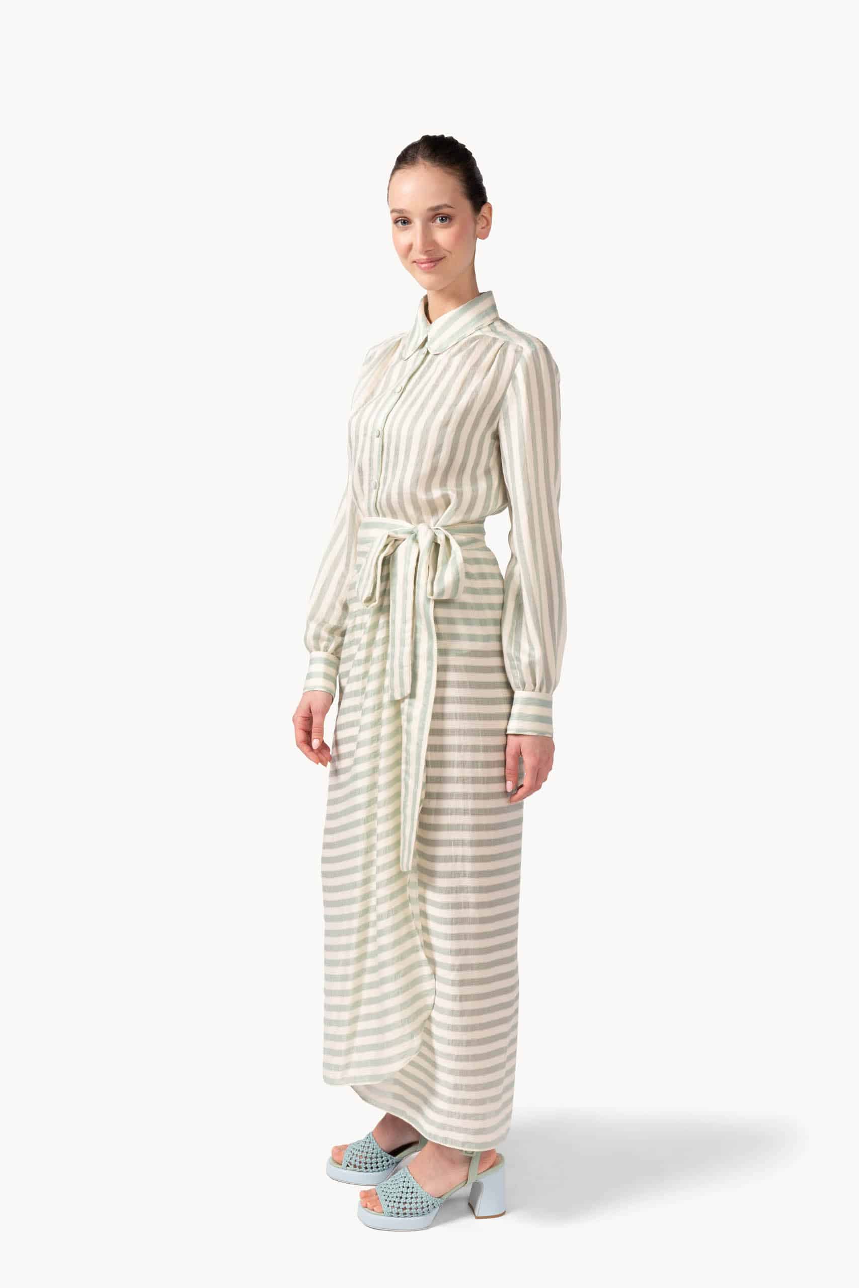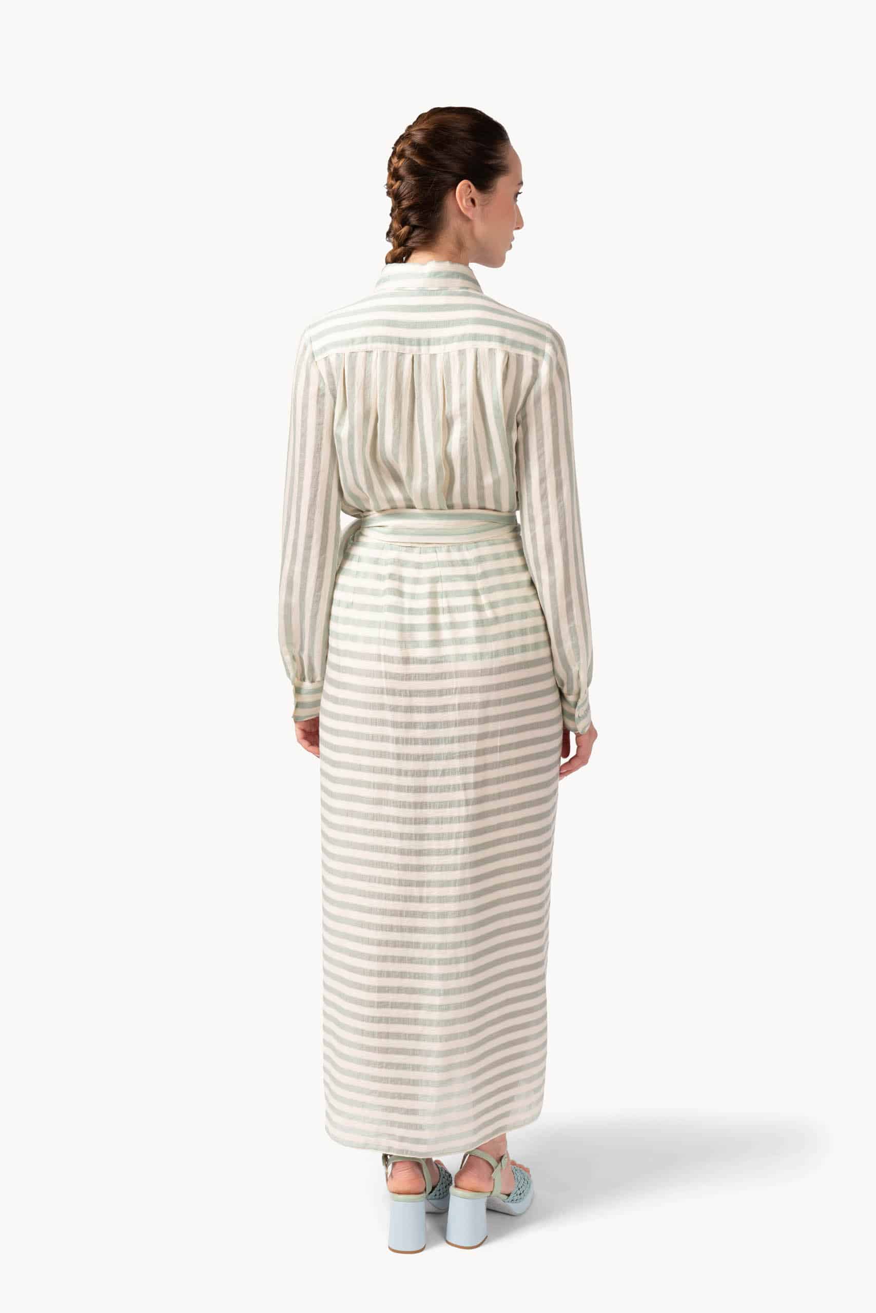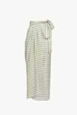 Designed to enhance the silhouette with effortless sophistication, the skirt combines texture and movement in a flattering wrap construction. The woven jacquard stripes add subtle dimension, while the adjustable waist tie allows for a personalized fit that feels both comfortable and refined.