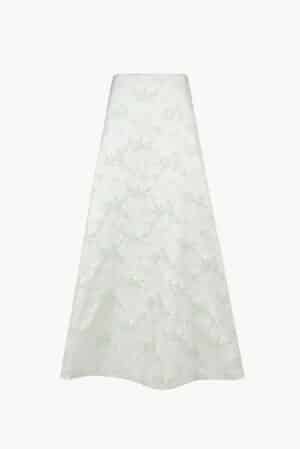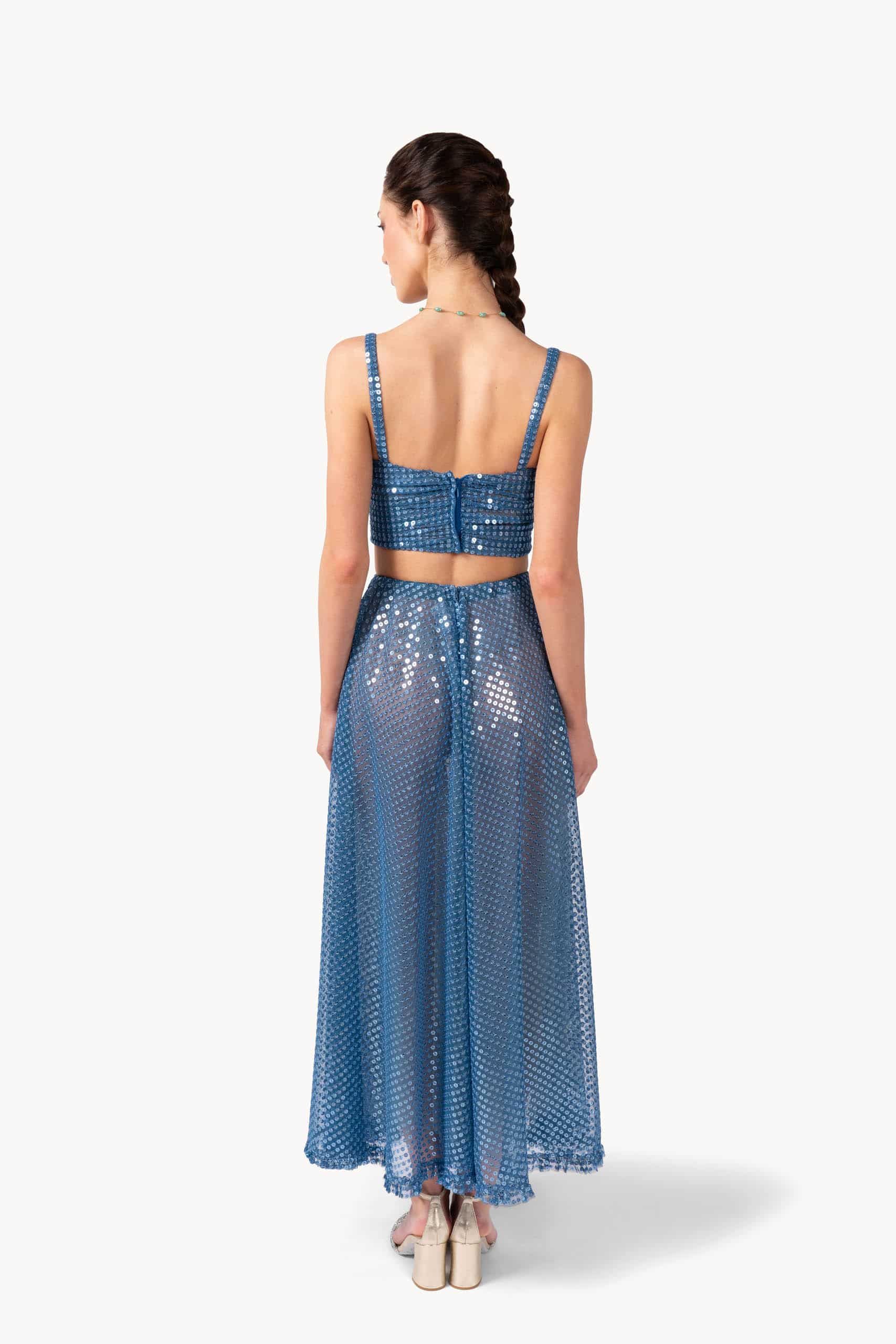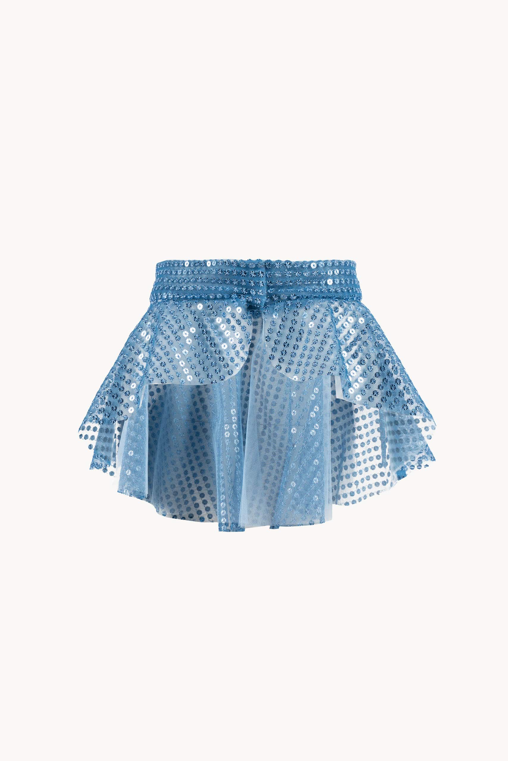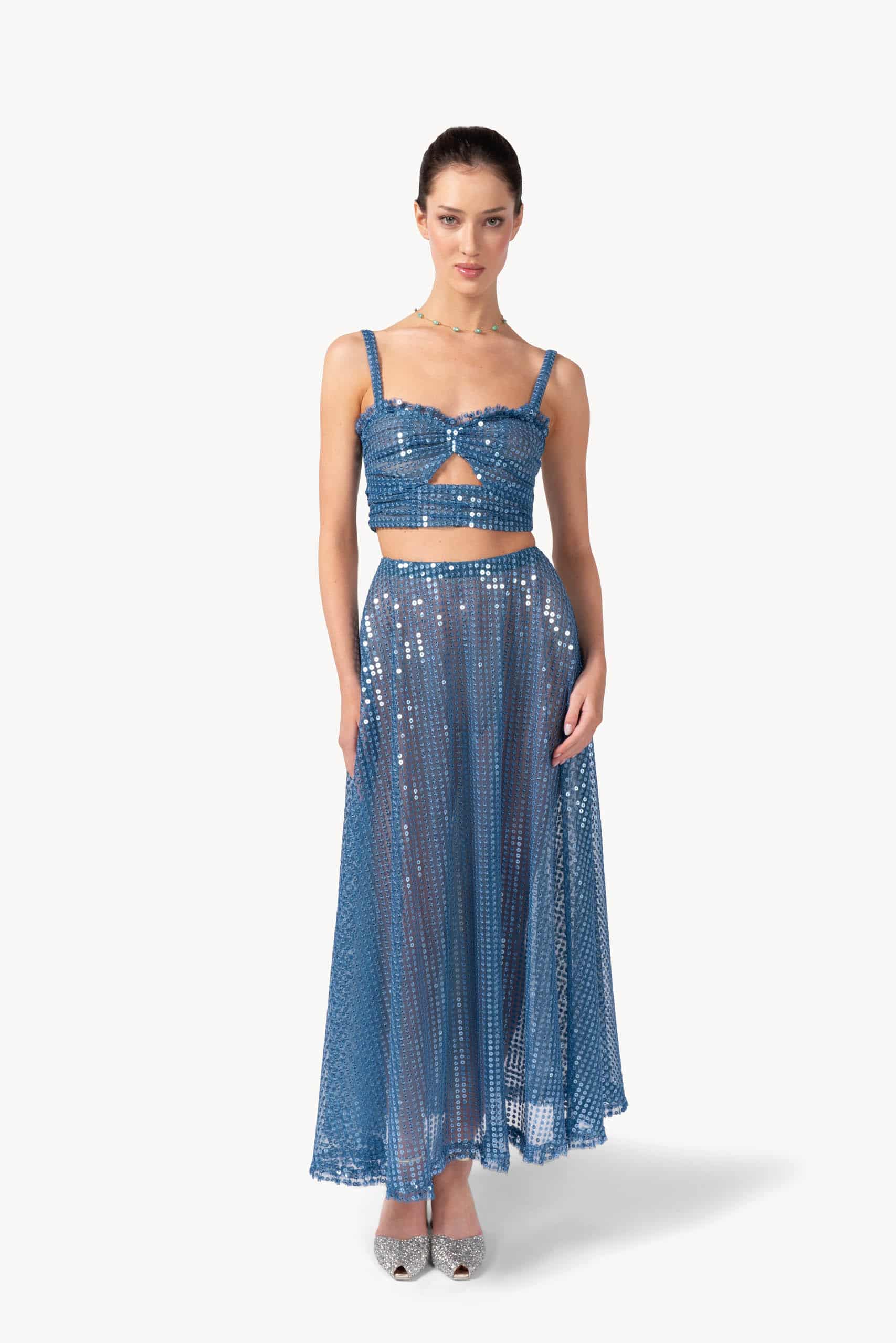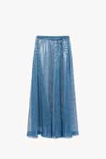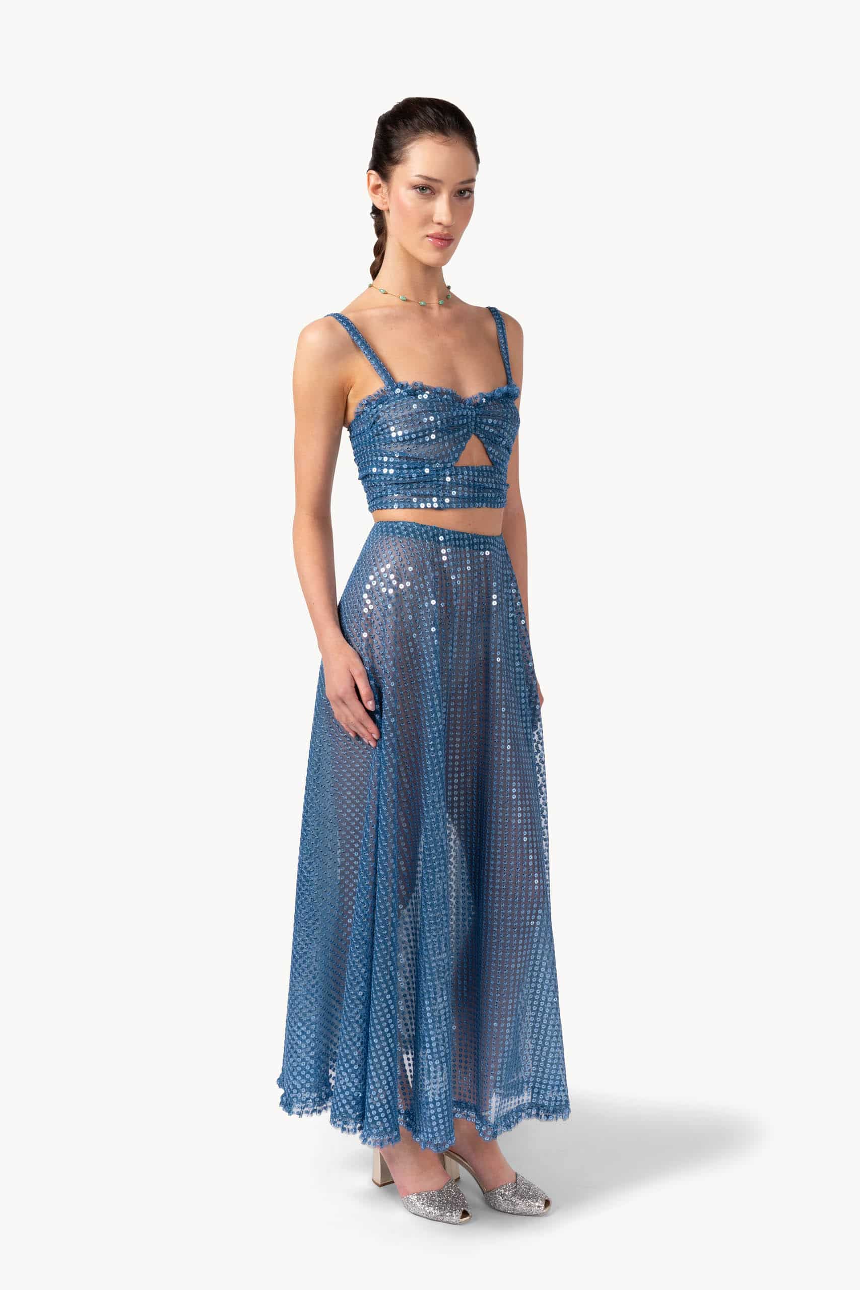 Adorned with glimmering sequins, the skirt is giving aluminous, airy effect, falling to a flattering mid-length, it creates a whimsical, statement-making silhouette perfect for celebrations, or elegant evenings.
