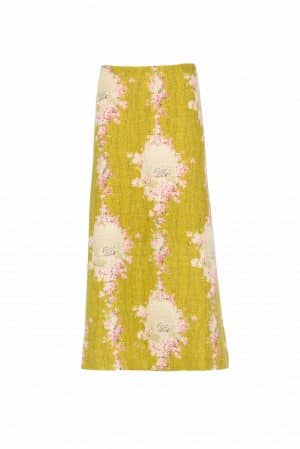 This skirt is crafted with macro flower printed velvet. It has an A line and a zip closure with a one single seam on the back.