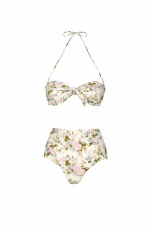 This bikini is designed in Abstract Flowers printed lycra. With high waist slips and gathered strap top, it gives a vintage touch to your beach outfit. Wear it with a matching dress.