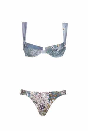 A romantic two-piece swimsuit featuring a delicate floral print inspired by the corporate print of Luisa Beccaria. The balconette top offers a flattering, structured fit with softly ruched wide straps, while the low-rise bottoms feature side gathers for a comfortable and feminine silhouette. Perfect for sun-drenched days and seaside getaways.