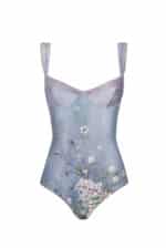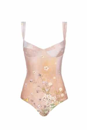 A romantic one-piece swimsuit featuring a delicate floral print from the corporate Luisa Beccaria print, sun-kissed tones. Designed with a flattering balconette neckline and lightly ruched shoulder straps, it offers both support and elegance. The smooth silhouette enhances the figure while the botanical motif evokes a sense of timeless femininity—perfect for refined escapes by the sea or poolside lounging.