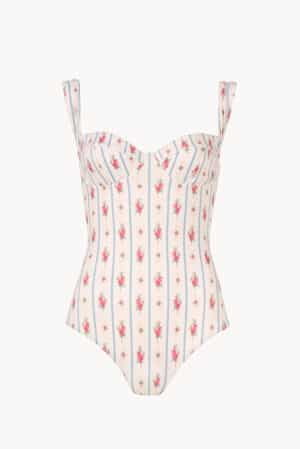 A romantic one-piece swimsuit featuring a delicate floral print from the corporate Luisa Beccaria print, sun-kissed tones. Designed with a flattering balconette neckline and lightly ruched shoulder straps, it offers both support and elegance. The smooth silhouette enhances the figure while the botanical motif evokes a sense of timeless femininity—perfect for refined escapes by the sea or poolside lounging.