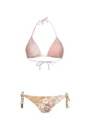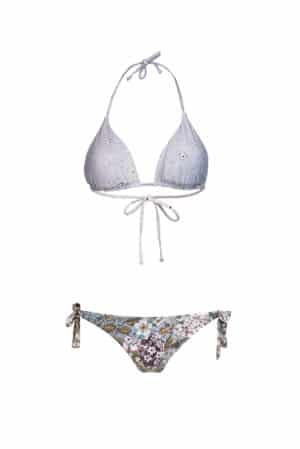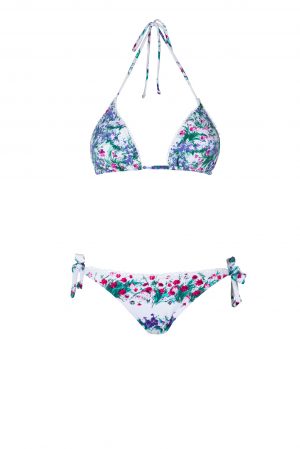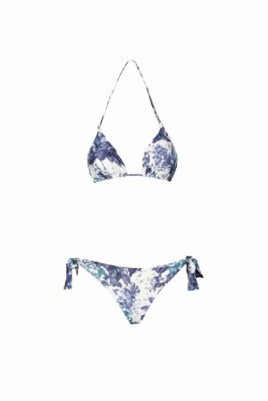 This two-piece swimsuit is designed in blue Monet printed lycra. It has an adjustable triangle bikini top and low waist slip with ties. You can wear it matching with shorts and pareo in the same print.