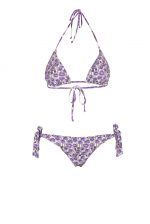 This reversible two-piece swimsuit is designed in poppies printed lycra. It has triangle bikini top and low waist slip with ties.
