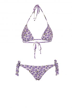 This reversible two-piece swimsuit is designed in poppies printed lycra. It has triangle bikini top and low waist slip with ties.