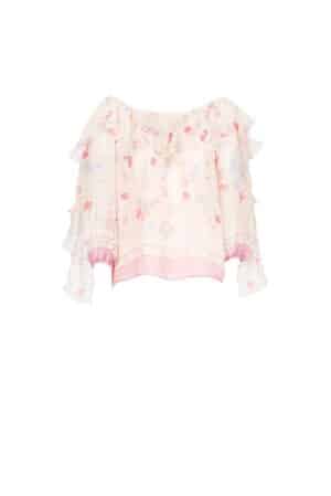 This boat neck blouse is crafted with printed Abstract Flowers in chiffon crepon. It has a big volant along the neck, puff sleeves and lined bodice. It can be worn with shoulder up or left down thanks to the elasticized neckline.