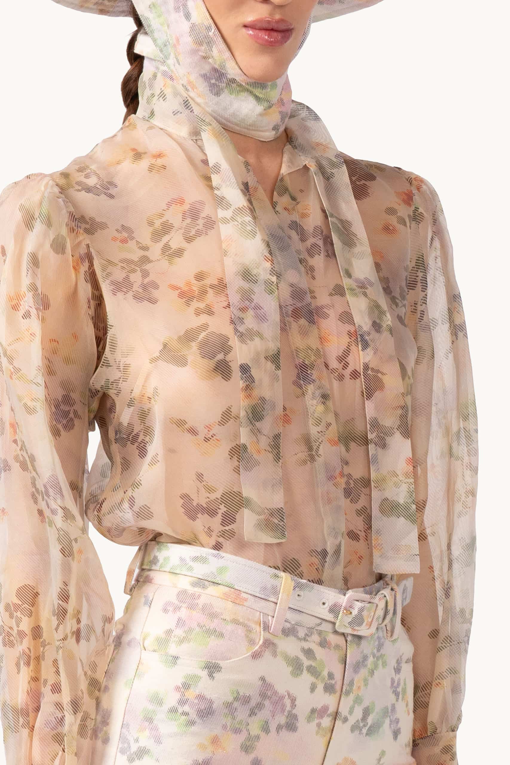 Light and ethereal, this piece is crafted in sheer organza adorned with delicate chiné florals that create a softly diffused, romantic effect. The airy silhouette and luminous texture bring a sense of graceful femininity, perfect for both daytime elegance and special occasions.