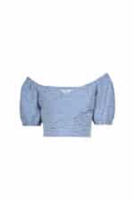 A crossover top with puffed sleeves in a striped pattern. The flattering wrap design adds a touch of elegance, while the voluminous sleeves create a playful and feminine silhouette. Perfect for adding a chic, modern twist to your everyday look.