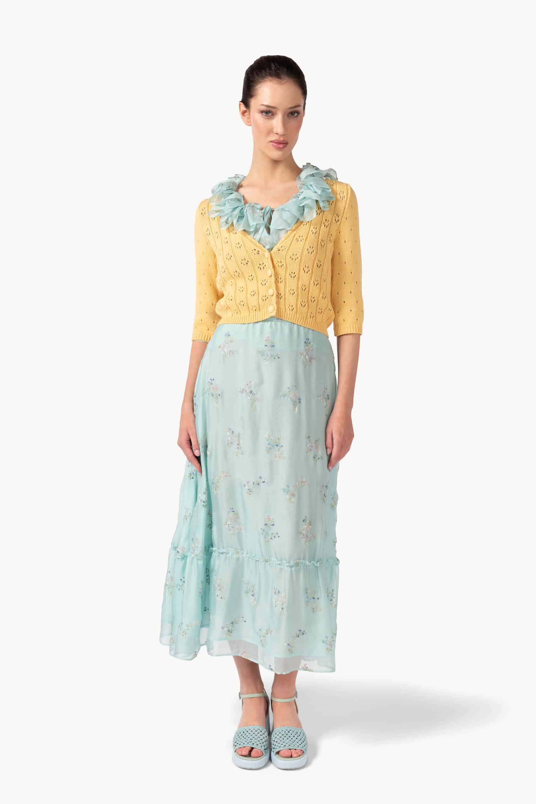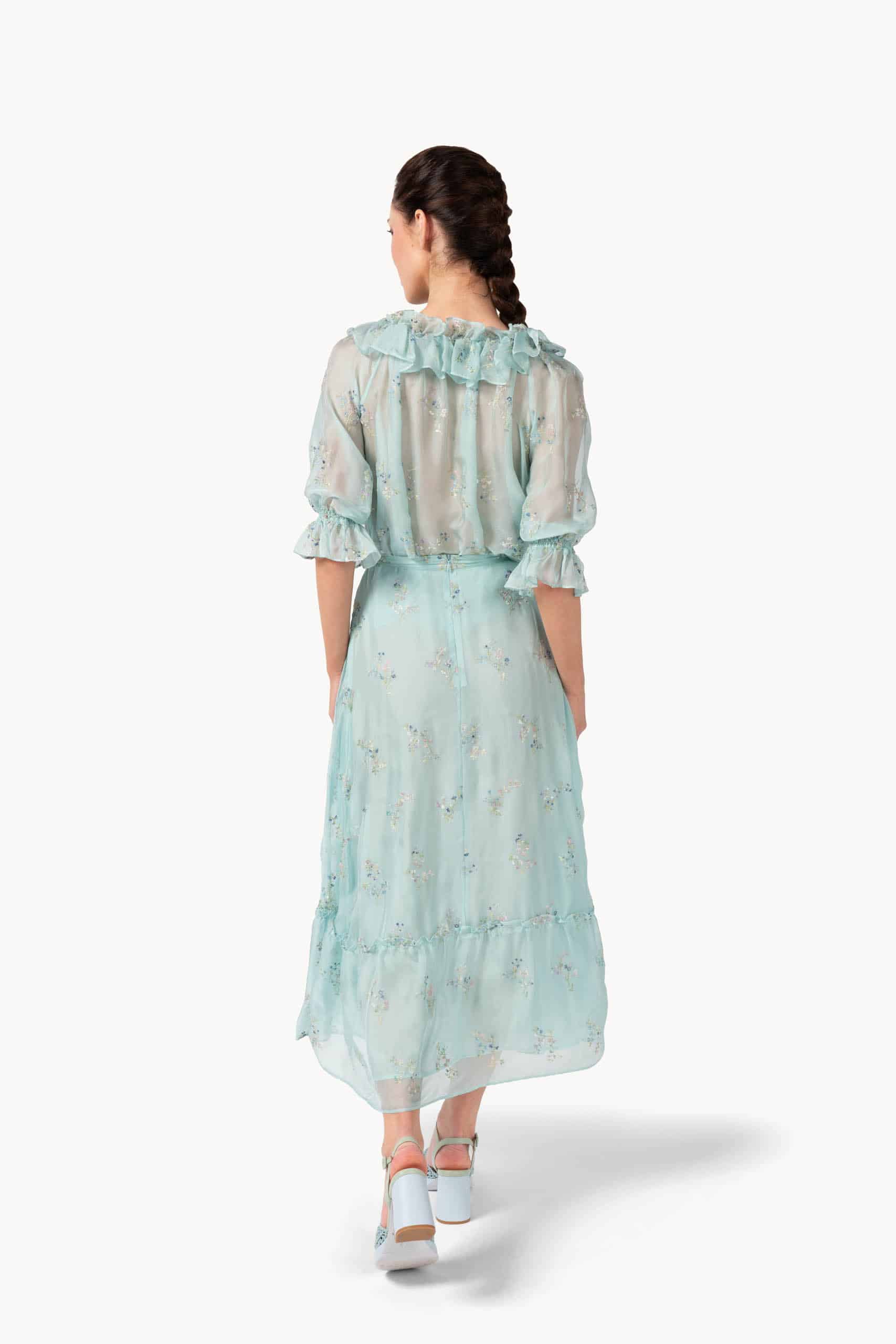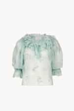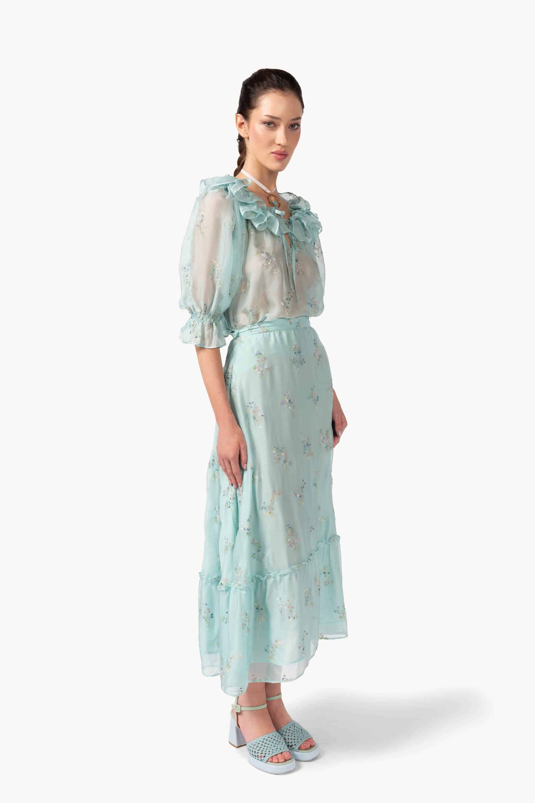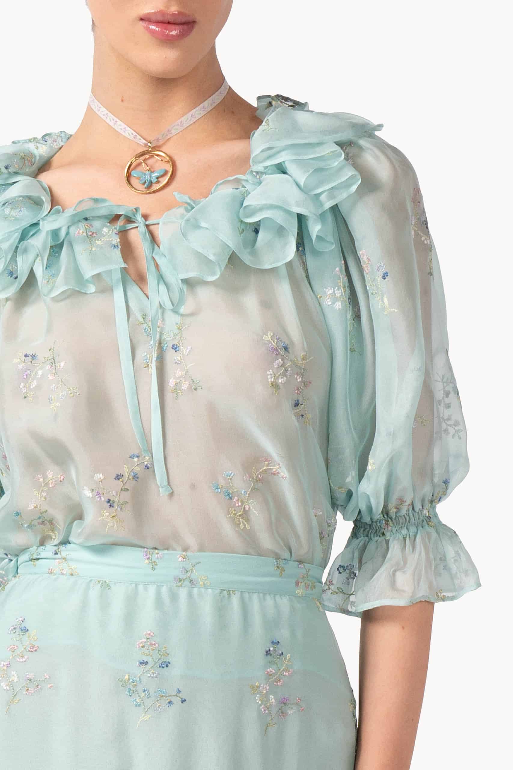 Light chiffon meets intricate embroidery in this blouse, with a softly ruffled collar adding subtle movement and charm.