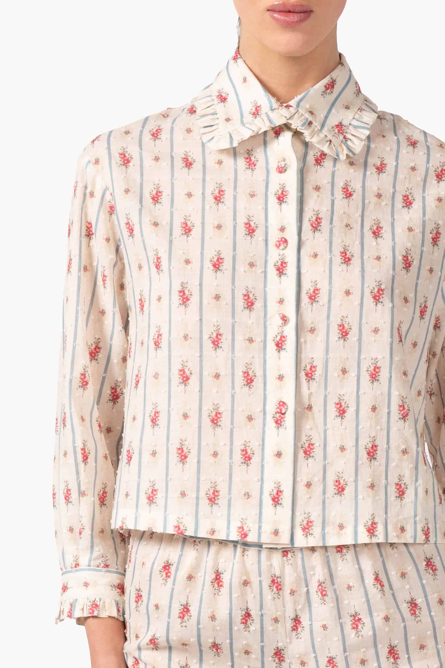 Playful mix of florals and stripes brings personality to this cotton plumetis shirt. The lightweight fabric and subtle textured dots create a refined, tactile appeal, while the relaxed cut ensures comfort and effortless versatility, perfect for both casual and polished daytime looks.