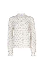 This delicate floral print shirt features a soft, feminine pattern and a charming rounded collar adorned with a refined pleated trim. The subtle details enhance its romantic appeal, making it perfect for both casual and dressier occasions.