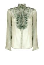 This blouse has a pleated jabot in the front, a hight collar and pleated long sleeves.