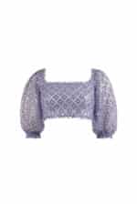 A cropped top crafted from delicate embroidered tulle, adorned with shimmering sequins. Featuring voluminous 3/4 sleeves, it strikes the perfect balance between romantic elegance and luminous charm. The intricate embroidery lends texture and a touch of refined whimsy.
