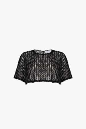 A white bolero in lace, adorned with delicate floral patterns, offering a perfect balance of originality and elegance. Its intricate floral details bring a touch of playfulness and charm, making it a standout piece that effortlessly adds sophistication and fun to any look.
