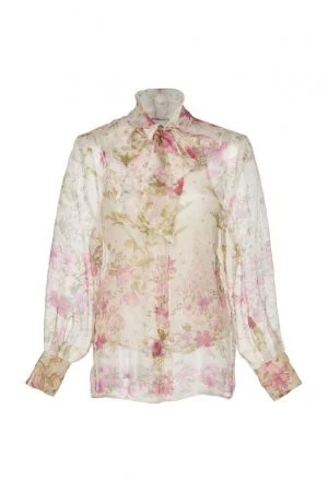Draped from polka dot silk chiffon, the piece is detailed with delicate pearl buttons and features a contrasting print at the cuffs and neckline.