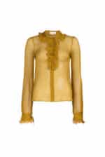 This airy, light mustard blouse features delicate ruffles and front pleats, adding movement and a romantic touch to its refined silhouette. Lightweight and elegant, it’s perfect for layering under jackets or pairing with high-waisted trousers for an effortlessly polished look.