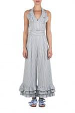 Cotton linen stretch blend halter top features tiered ruffle detailing along the neckline, banded hemline, v-neckline, and stripe print throughout.