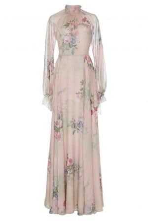This silk chiffon maxi dress is cut from an airy silk-chiffon that’s patterned with a blooming wildflowers motif. It has sheer blouson sleeve and is fully lined along the bodice for moderate coverage before falling to a fluid floor-length hem. The funneled neckline and cinched waistline is a modern interpretation of Victorian-era styles.