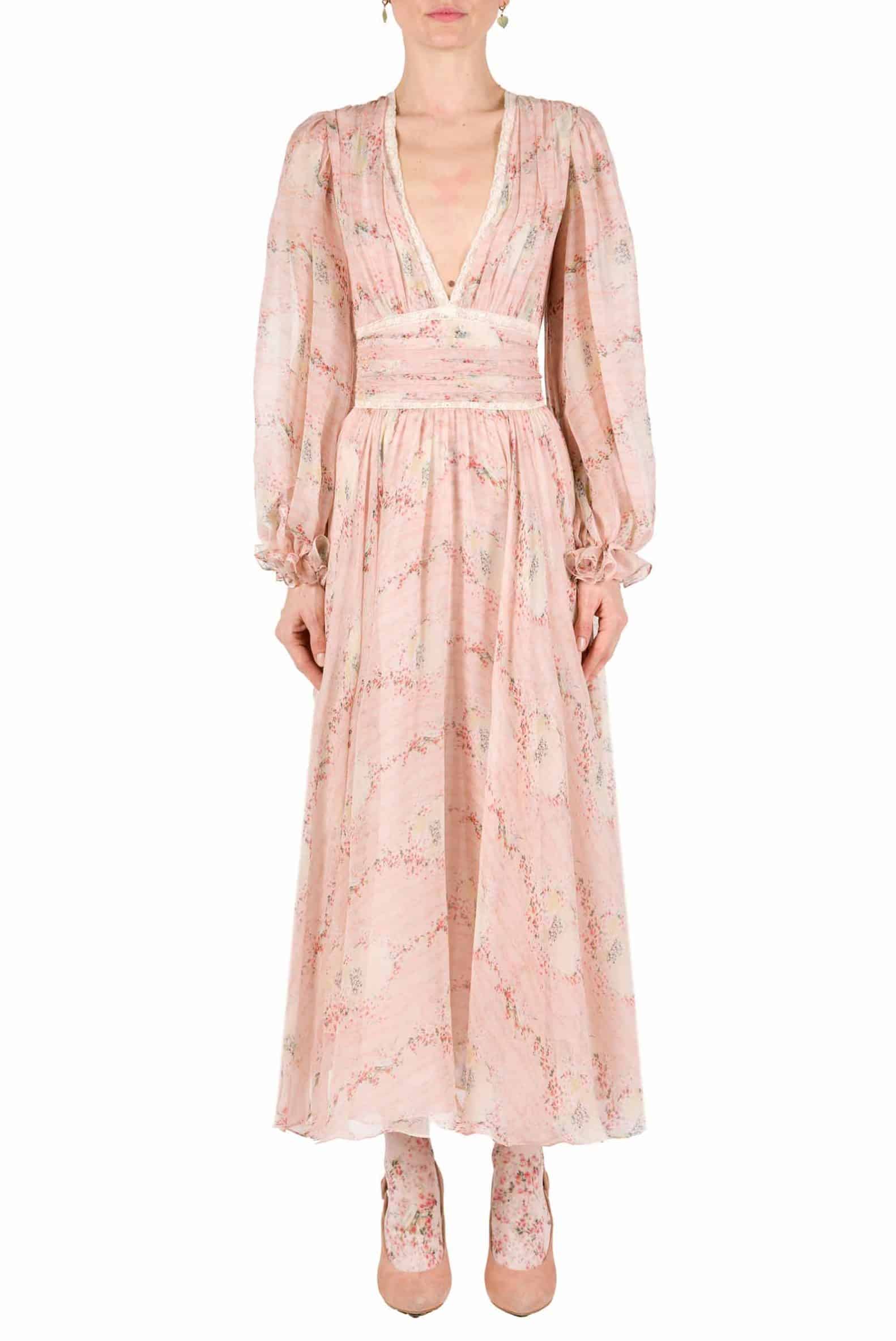 This chiffon dress is made with flowery printed chiffon. It has V neckline with lace on the edge and balloon sleeves draped in the bodice and waist. Product Details • Full length • V neckline • Balloon sleeves • Composition: 100% SE • Dry Clean Only • Made in Italy