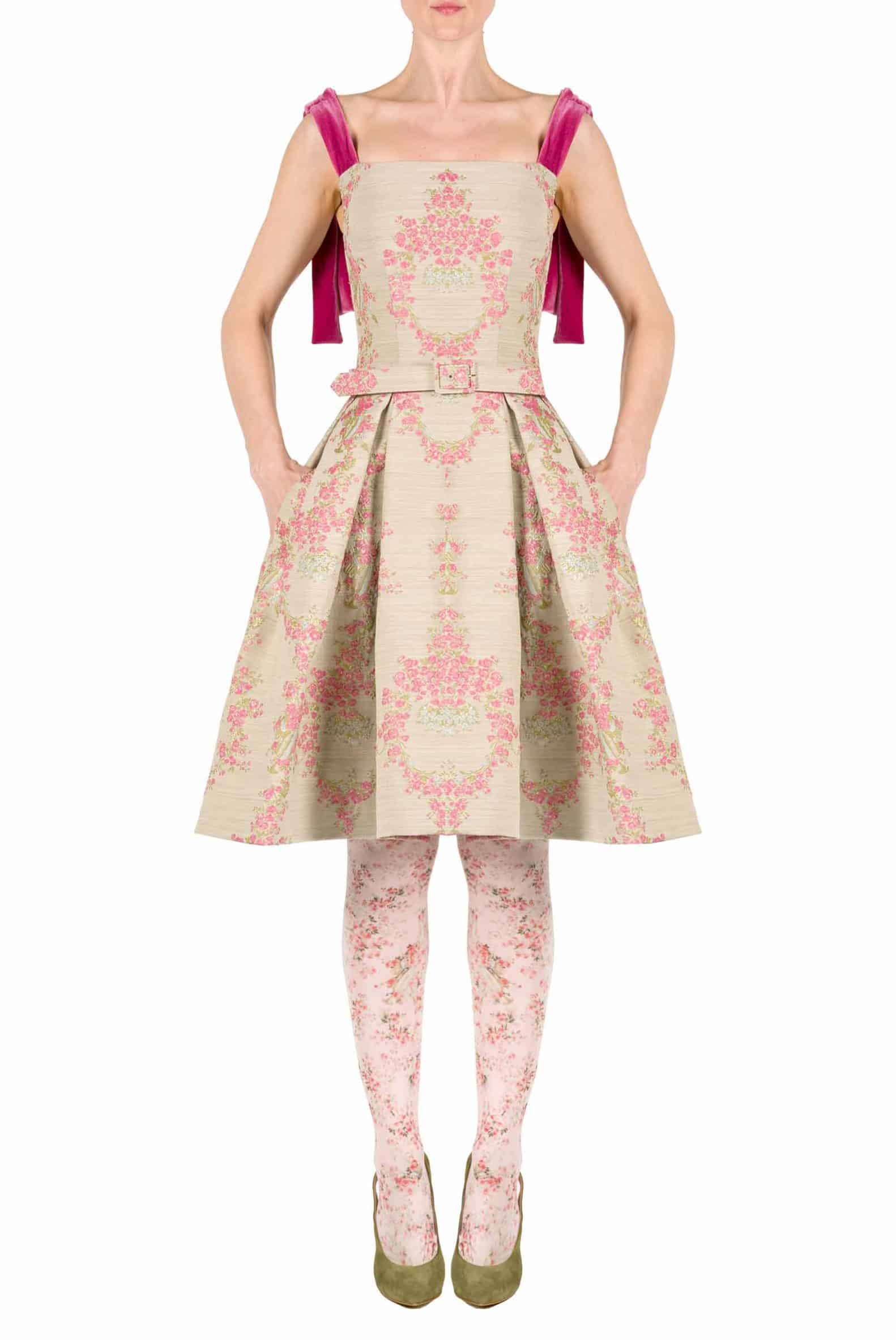 This dress is realised with floral brocade. It has two velvet bows on the shoulders, a boat neckline, a tight bodice and a wide pleated skirt. Product Details • Knee length • Back zipper closure • Velvet bows • Composition: 46% PL 30% WO 23% SE 1% EA • Dry…