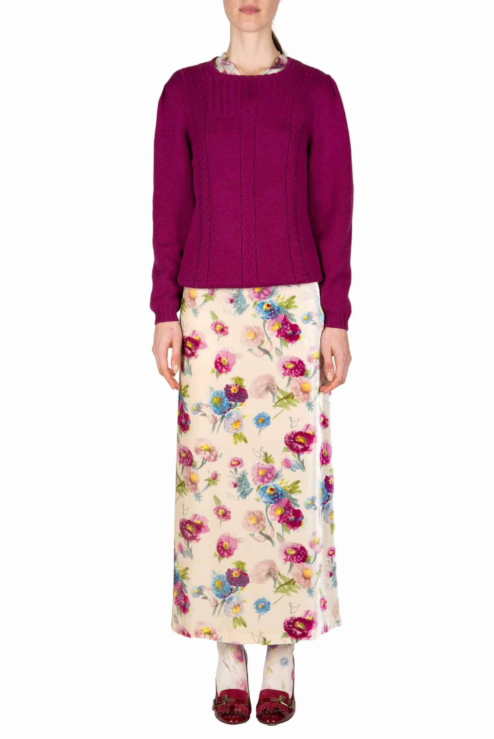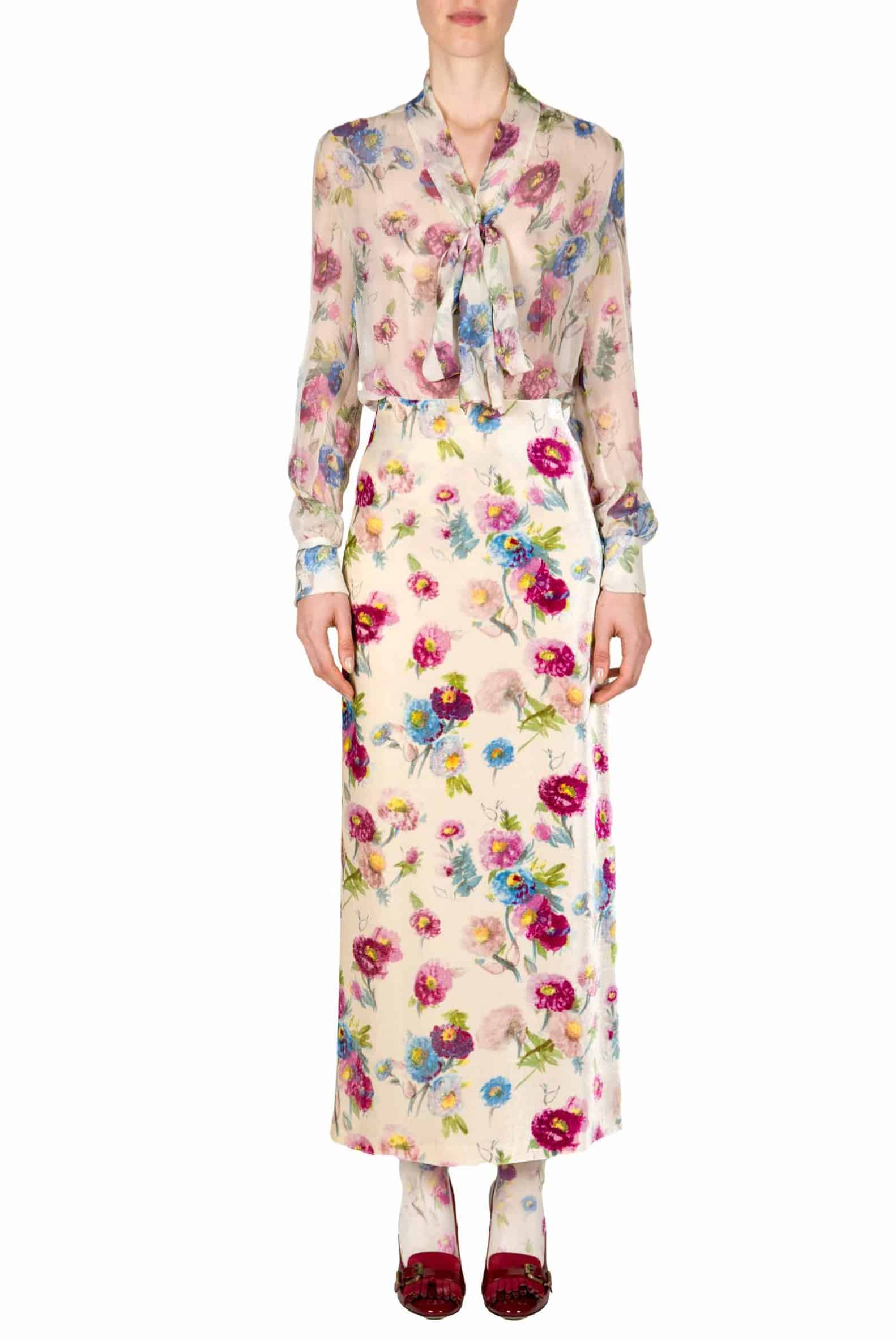 This skirt is crafted with macro flower printed velvet. It has an A line and a zip closure with a one single seam on the back. Product Details ● Full Length ● Composition: SE 100 % ● Dry clean only ● Made in Italy