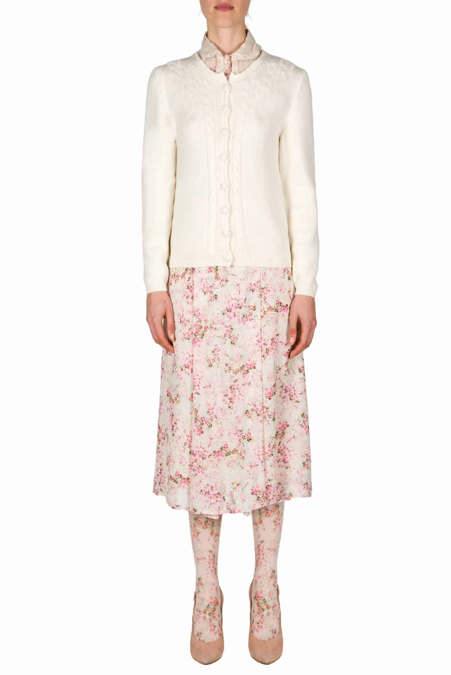 This cable knit cardigan has a round neck with little buttons closure in the front. Product Details ● Round neck ● Long sleeves ● Composition: WO 100% ● Dry clean only ● Made in Italy